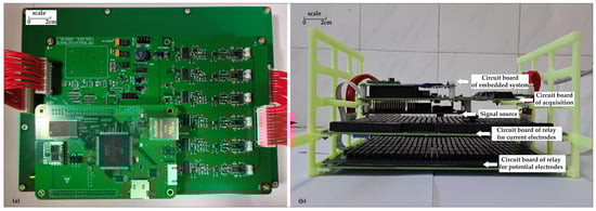 The measurement system primarily consists of a CPLD acquisition circuit board, a signal source circuit based on the AD9956 core, and two relay circuit boards. It is responsible for data acquisition and meets the design requirements of high precision and low power consumption. Figure 2 depicts the physical layout of the instrument’s main hardware circuit boards, including the embedded system, the CPLD, the signal source, the current electrode relays, and the potential electrode relays.