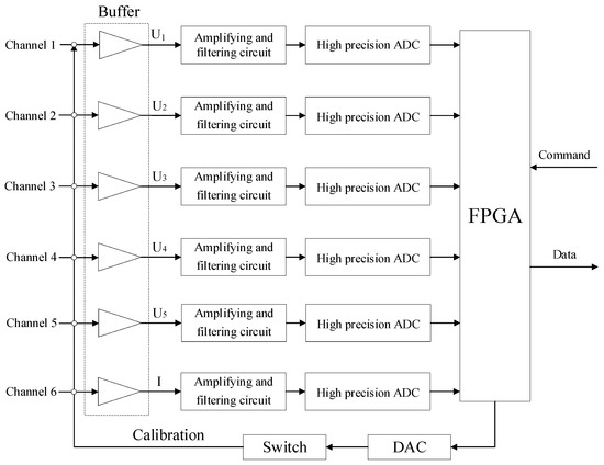 The acquisition circuit board, as shown in Figure 4, is responsible for data acquisition, including modules such as the front-end circuit, ADC circuit, FPGA, and power supply circuit. The acquisition circuit board comprises six channels, consisting of five voltage measurement channels and one current measurement channel. When the signal source supplies an AC signal of a specific frequency to the object under test, the acquisition circuit board can measure the electrical signals at different positions of the object, converting the analog signals into stable digital signals and transmitting them to the embedded system circuit board [25]. It concurrently undertakes the responsibility of receiving commands from the control system through the SPI bus, subsequently parsing them to configure other modules of the measurement system. This configuration facilitates calibration and data acquisition functionalities.