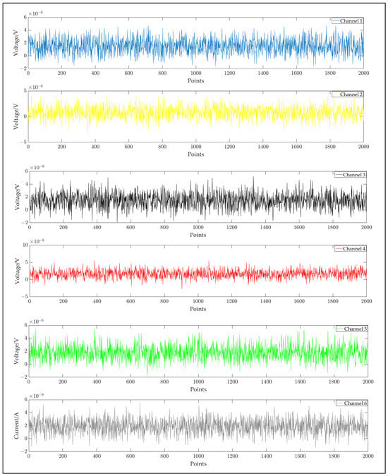 Figure 5 illustrate the short-circuit input noise data curves of the six channels of the acquisition circuit board at a sampling rate of 1000 SPS and a gain value of 1. It is evident from the illustrated figures that the overall short-circuit noise of the acquisition channels is relatively low, with only minor variations among individual channels, thereby meeting the design specifications.