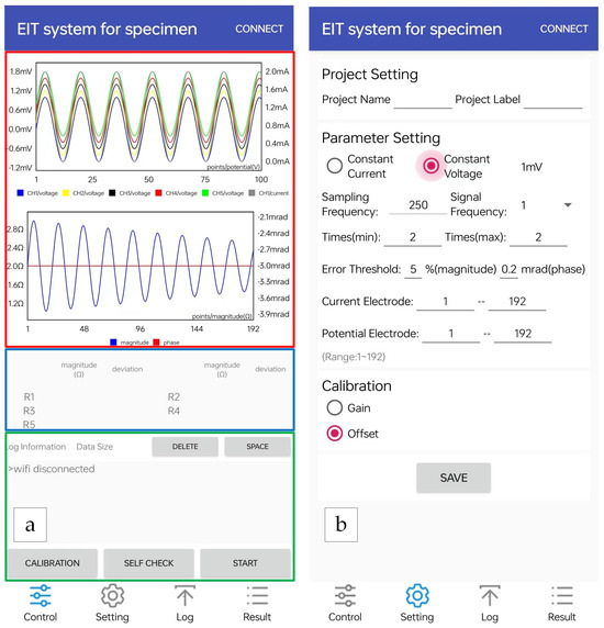 Interface of application. The interface (a) represents the interface of the acquisition and control module, which serves as the main interface of the software and is divided into three sections. (Red, blue, and green outlines are added for annotation and are not part of the actual interface.) The interface (b) illustrates the interface of the parameter settings module, which is divided into three sections: Project Setting, Parameter Setting, and Calibration. In the Parameter Setting module, users can select between two different measurement modes: constant voltage or constant current. They can also specify the magnitude of voltage or current, the sampling frequency, signal frequency, and the time of repeated measurements, as well as the range of potential electrodes and current electrodes. Both the potential electrodes and current electrodes span a range from 1 to 192.