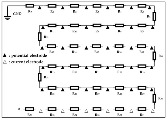 Model Ι. The resistance values are uniformly set to 1000 Ω. The black triangles represent current electrodes, with current electrode 1–30 selected in this test. Specifically, the current electrode labeled as 1 is located between R0 and R1. On the other hand, the white triangles represent potential electrodes, with potential electrode 1–6 chosen in this test. Specifically, the potential electrode labeled as 1 is positioned between R30 and R31.