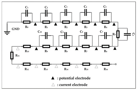 Model II. The resistance values are uniformly set to 1000 Ω and the capacitance values are uniformly set to 10 μF. The black triangles represent current electrodes, with current electrode 1–10 selected in this test. Specifically, the current electrode labeled as 1 is located between R0 and R1. On the other hand, the white triangles represent potential electrodes, with potential electrode 1–6 chosen in this test. Specifically, the potential electrode labeled as 1 is positioned between R10 and R11.