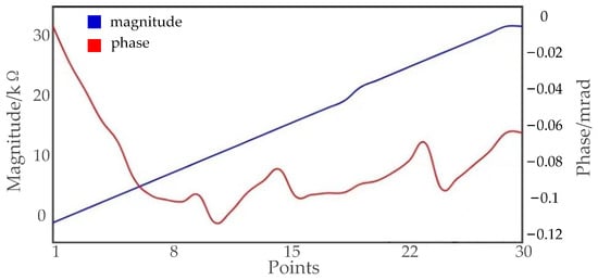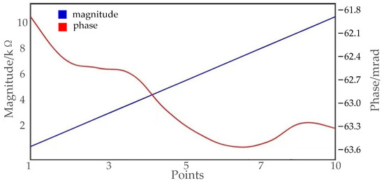 The testing results of model II are illustrated in Figure 10. The displayed charts in the App depict the graphs illustrating amplitude and phase when the potential electrode labeled as 1 is active. The complete measurement results for the model are presented in Table 3. The results demonstrate high accuracy in data acquisition, with a measurement error of less than 0.3% for resistance and within 1 mrad for phase measurements.