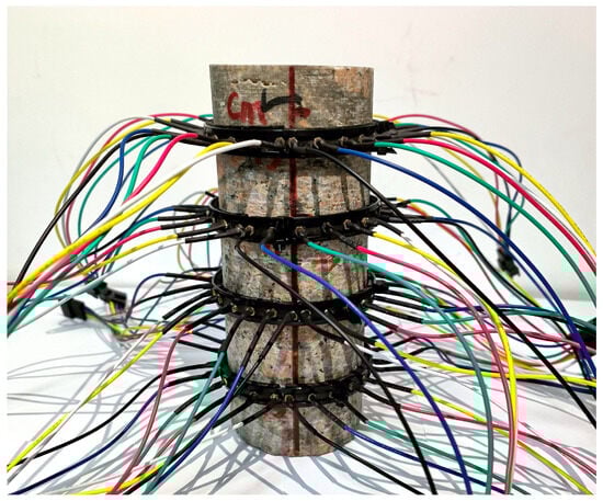 Following the soaking process, the rocks underwent a brief air-drying period. This step aimed to ensure the specimens’ surfaces were dry, preventing residual water interference with the measurement results. Due to the cylindrical shape of the specimen, electrode connections were arranged in a circular pattern. At positions 3 cm, 7 cm, 11 cm, and 15 cm (marked in red in Figure 11a), a circular array of electrode connections was established [35], with 24 electrodes in each circle. Among them, the electrodes at positions 3 cm and 11cm served as potential electrodes, while the other two positions were designated as current electrodes. The grounding electrode was placed at the center of the base [36]. The schematic diagram illustrating the arrangement of electrodes is presented in Figure 12. To enhance electrode–sample coupling, a damp dough was applied at the contact points between each electrode and the specimen. Figure 11b reveals the presence of a noticeable crack in the physical specimen [37].