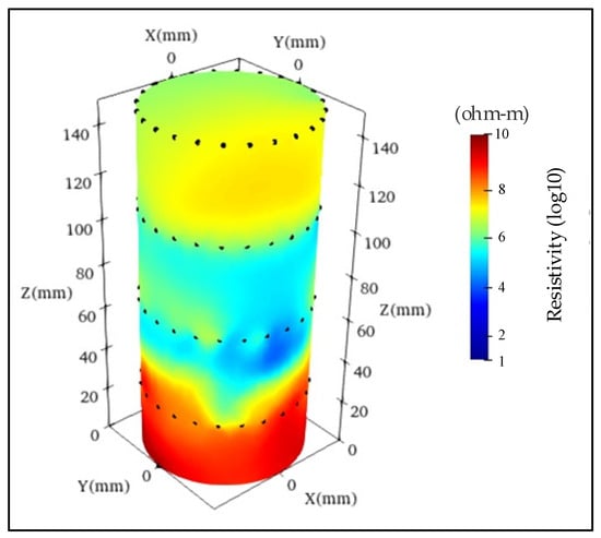 Firstly, the three-dimensional resistivity inversion imaging was conducted based on the magnitude and current data. The results are shown in Figure 13. From the inversion results, it can be observed that there is a significant low resistivity zone along the Z-axis at 30–60 mm, which corresponds to the location of the crack on the surface of the specimen. This can be attributed to the decrease in resistivity caused by water-filled cracks. In other positions of the specimen, the resistivity values remain relatively constant and exhibit a uniform distribution, corresponding well with the specimen.
