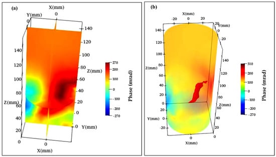 After performing Fourier transform on the raw data, phase data were obtained. Figure 14 shows the inversion results of the phase. In Figure 14a, a three-dimensional segmentation algorithm was applied to the specimen, revealing the phase distribution of the specimen’s cross-section. In Figure 14b, a threshold technique was employed to extract high phase values in the fracture zone, providing a better reflection of the fracture locations.