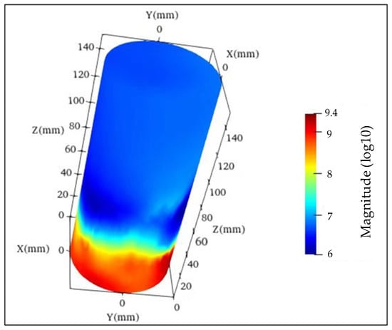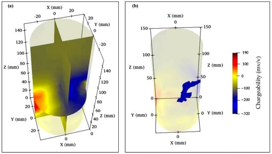 Figure 15 illustrates the inversion results of the resistivity magnitude. Based on the impedance data, the chargeability [38] results can be calculated, as shown in Figure 16. It can be observed that both inversion results reflect the locations of cracks in the specimen. We also observe the presence of a red anomaly in Figure 16. Considering that the sample was not subjected to splitting procedures, we speculate that the presence of the red dots may be indicative of internal variations in density, porosity, moisture content, and other factors relative to the surrounding area.