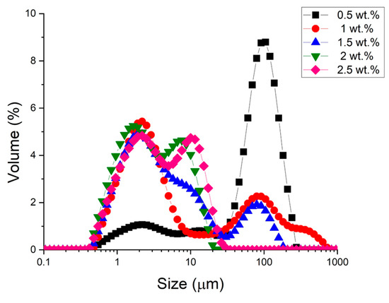 We observed that as the concentration of cricket flour increases, the droplet size distributions shift towards smaller sizes. At a concentration equal to or higher than 1 wt.%, the main peak is around 1–2 microns. Furthermore, it is noteworthy that at a concentration equal to or higher than 2 wt.%, the peak around one hundred microns disappears. These results highlight the need for a minimal amount of cricket flour, which acts as an emulsifier and a stabilizer at the oil–water interface, to obtain small droplet sizes. Finally, it should be noted that within the range of concentrations studied and with the processing used, all the distributions are multimodal.