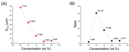 It should be noted that droplet size is a key factor influencing emulsion properties such as physical stability and rheological properties. Droplet size mainly depends on formulation and processing conditions. The smaller the droplet size, the less likely the emulsions are to be destabilized by creaming or coalescence [3]. Figure 2A shows the values of the volumetric mean diameter of the emulsions studied as a function of cricket flour concentration. A decrease in mean droplet size is clearly observed as the amount of emulsifier increases, as mentioned above. However, an optimum (minimum value) of this parameter is also shown for the 2 wt.% concentration. This could be explained by the fact that a depletion flocculation effect may be taking place at this concentration [20]. In the case of the span parameter, the lowest value is observed for the lowest emulsifier concentration. However, it should be noted that this is because the peak of the largest droplet volume is located at a large size, so that the lower polydispersity in this case is not an advantage. For the samples with the highest emulsifier concentration, the lowest value is again obtained for the 2 wt.% concentration, so this is the concentration that will be used in the following stages of this study.