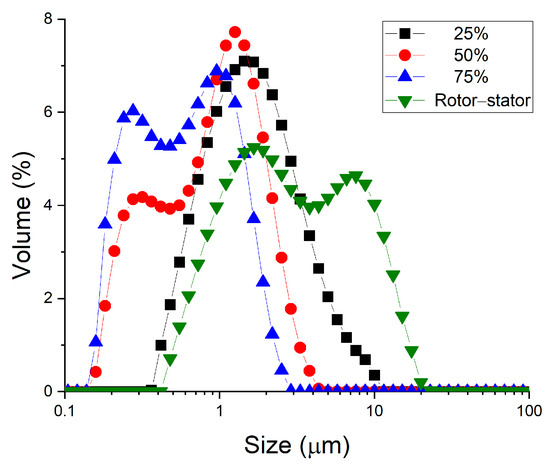 Droplet size distribution of all studied emulsions containing 2 wt.% of cricket protein as a function of sample processing. The system indicated as rotor–stator involved only primary homogenization. The values of 25%, 50% and 75% correspond to the amplitude used in an ultrasonic system in secondary homogenization.