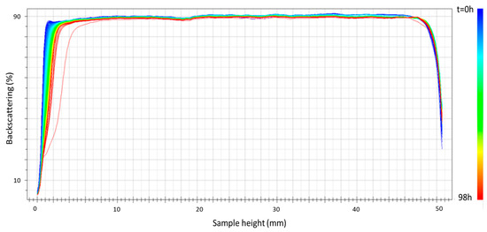 Figure 5 shows the results of the physical stability of the sample prepared using ultrasound at 75% amplitude as an example of the emulsions prepared with this emulsification method. A clear improvement in the stability results is shown for this emulsion for 98 h of aging time compared to the emulsion processed using only the rotor–stator device for 24 h (see Figure 3). This improvement must be attributed to the decrease in droplet diameters (see Table 1). It should be noted that in none of the samples was there any variation in backscattering in the intermediate zone of the vial, which could rule out changes in the droplet size or aggregation of the droplets. In any case, a physical stabilizer was incorporated into the formulation to inhibit this creaming destabilization mechanism.