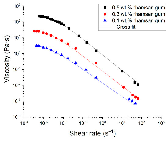 Figure 6 shows the flow behavior for the optimized emulsions containing 0.1, 0.3 and 0.5 wt.% rhamsan gum. All the samples studied exhibited shear thinning behavior, which was also fitted to a Cross model (R2 > 0.99):
