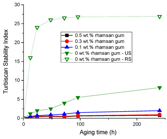 Finally, to check the effect of the addition of rhamsan gum on the physical stability of the emulsions, the results of the Turbiscan stability index (TSI) as a function of time are shown in Figure 8. Firstly, this parameter shows that the emulsions prepared with ultrasound (US) are more stable than those prepared only with a rotor–stator system (RS), confirming what has already been discussed in Figure 3 and Figure 5. On the other hand, the addition of rhamsan gum significantly improves the physical stability (lower TSI vales) of the systems, especially in emulsions with concentrations above 0.3 wt.%. This must be associated with the increase in viscosity discussed above as well as the viscoelastic properties.