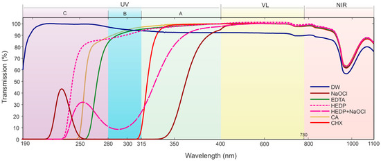 Transmission values of distilled water, NaOCl, EDTA, Dual Rinse HEDP, Dual Rinse HEDP + NaOCl, citric acid, and chlorhexidine at different wavelengths of ultraviolet, visible light, and near-infrared regions. Abbreviations: UV—ultraviolet; VL—visible light; NIR—near infrared; C—ultraviolet C; B—ultraviolet B; A—ultraviolet A DW—distilled water; NaOCl—sodium hypochlorite; EDTA—ethylenediaminetetraacetic acid; HEDP—1-hydroxyethylidene 1,1-disphosphonate; HEDP + NaOCl—1-hydroxyethylidene 1,1-disphosphonate + sodium hypochlorite; CA—citric acid; CHX—chlorhexidine digluconate.