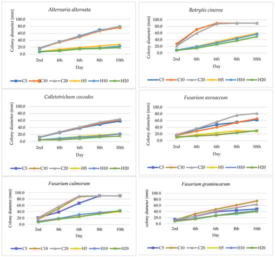 Colony diameter (mm) of fungi growing on potato dextrose agar (PDA) with addition of hemp extracts; C5, C10, C20—control with 5, 10, 20% residue of solvent; H5, H10, H20—5, 10, 20% hemp extract concentration.