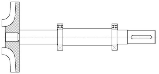 The shaft system of a single-stage centrifugal pump usually employs a single-span cantilever structure, as depicted in Figure 3. Due to the impeller’s location at the extremity of the shaft system, its weight and load can induce bending deformations in the pump shaft. This deformation can lead to an increase in the reaction force on the bearings, potentially harming their normal functioning. During operation, the centrifugal pump’s bearings are subjected to both radial and torsional vibrations caused by the system’s inertia and elasticity. The phenomenon of resonance may arise when the vibration frequency of the pump shaft aligns with its internal vibration frequency. If the torsional stress exceeds the pump shaft’s allowable stress, there is a risk of shaft fracture.