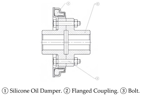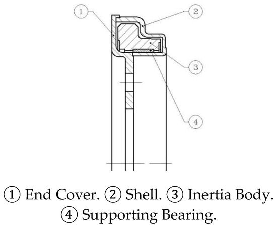 The silicone oil damper mainly consists of four components: the end cover, shell, inertia body, and supporting bearing, illustrated in Figure 5. The end cover and shell form a sealed cavity, within which the inertia body is free to rotate. Uniform gaps between these elements are maintained by the supporting bearing, and these gaps are filled with high-viscosity silicone oil.