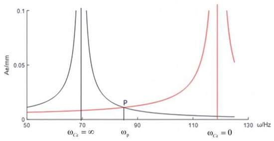 From Figure 7, point P is where the curves for Cd = 0 and Cd = ∞ intersect, independent of damping Cd. If a damping value Cdp exists that minimizes the system amplitude Aep, Cdp is considered optimal damping. The frequency at point P is calculated with Formula (23).