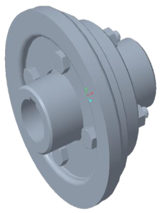 The structure size of the inertia ring of the silicone oil shock absorber is shown in Figure 9. The primary sources of vibration in the pump shaft transmission system originate from the coupling connecting the electric motor and the pump shaft. For optimal vibration damping, the design places the damper near the vibration source. In this design, the silicone oil damper is bolted to the flanged coupling, as depicted in Figure 10. Using Creo 5.0 software, a 3D model of the inertia ring was established, confirming that the calculated rotational inertia Ie of the inertia ring meets the design requirements, as shown in Figure 11.