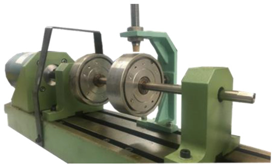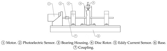 The test rig is powered by a direct current (DC) motor, connected to the shaft via a rigid coupler, which drives the disc rotor to rotate. The rotational speed of the system is captured by a photoelectric speed sensor, while the vibrational displacement is measured by an eddy current sensor. The signals, after being filtered and shaped by the data collector, are transmitted to a monitoring computer through a 1394 interface card. The setup of the testing system is illustrated in Figure 16.