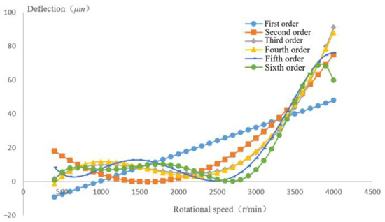 - Employing a single-span cantilever structure for experimentation, the deflection values of the cantilevered rotor were recorded. Polynomial fitting methods were used to derive the speed–deflection mathematical expression and curve under the first critical speed, resulting in an ideal speed–deflection relationship.