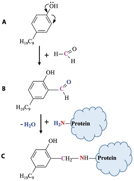Scheme of conjugation of nonylphenol with carrier protein by Mannich reaction. (A)—nonylphenol structure; (B)—intermediate compound having active group reacting with primary amines to form the hapten–protein conjugate—(C).
