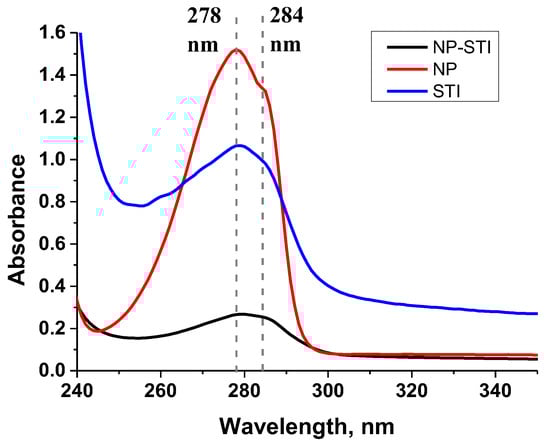 Absorption spectra of the NP–STI conjugate, NP and STI.
