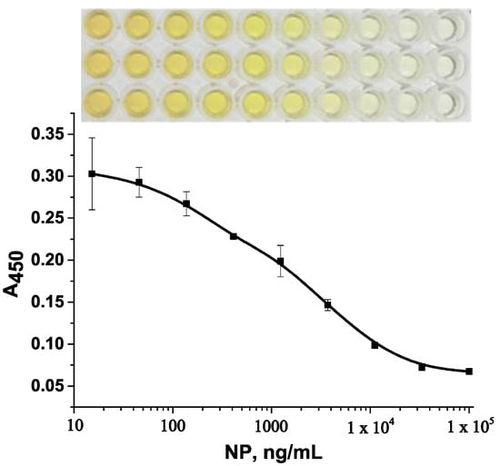 For competitive immunoassay, NP solutions with different concentrations (from 100,000 µg/mL to 0.01 ng/mL) in methanol: water (1:4) were added to the wells and then anti-NP rabbit antiserum in chosen dilution in equal volume. The incubation was provided for 1 h at +37 °C. The development of complexes was provided as described above.