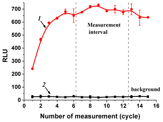 For chemiluminescent EIA, the kinetic measurement mode was used in each stage of this investigation, both when optimizing parameters and when obtaining calibration dependencies. This means that after measuring all 96 wells of the plate, which takes a total of 120 s, the next measurement of equal duration begins. In total, data obtained after 15 consecutive chemiluminescence measurements in all wells of the plate were analyzed.