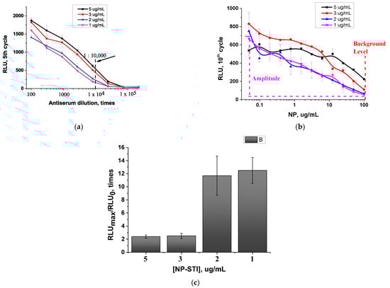 As can be seen from Figure 6a, the signal intensity depends on the concentration of the NP–STI conjugate immobilized in the wells of the microplate. Figure 6b shows the dependence of the intensity of the chemiluminescent signal on the concentration of the analyte. Thus, it is clear that the level of the background signal increases (at the maximum concentration of the analyte, Figure 6b) with the increase in concentration of the NP–STI. The maximum amplitudes of the analytical signal with a minimum deviation value were achieved when using a concentration of NP–STI 1 μg/mL (Figure 6c) in combination with a dilution of antiserum of 1:10,000 to conduct a competitive analysis of nonylphenol.