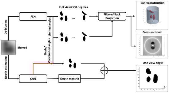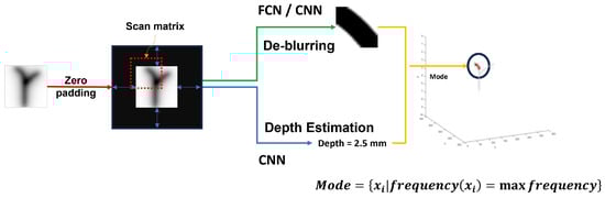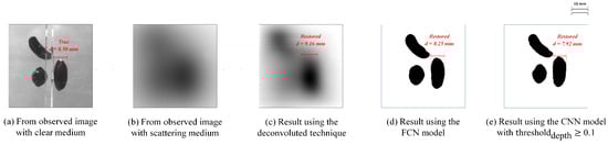 27]. The research team has succeeded in suppressing scattering and estimating depth using convolutional neural network (CNN) and fully convolutional network (FCN) models. Using the proposed technique from Van et al., the de-blurred images, depth information, and three-dimensional (3D) structure of simple or single absorption structure were estimated [