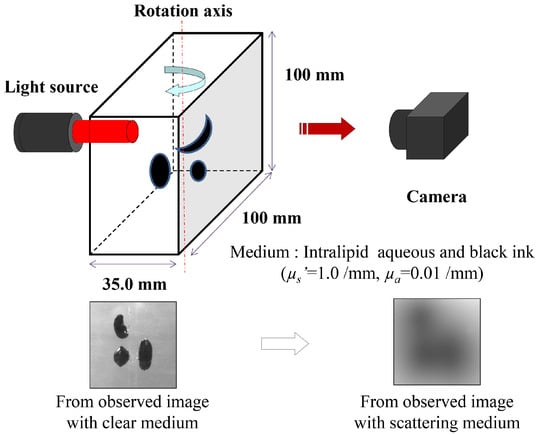Figure 7 presents a schematic of the experimental system for obtaining transillumination images. The phantom was irradiated with near-infrared (NIR) light 800 nm from a laser through a beam expander and a diffuser for homogeneous illumination. Images were captured at all 360 degrees using a CMOS camera placed on the opposite side of the phantom. The image observed with the scattering medium is quite blurred compared to the image observed with the clear medium.