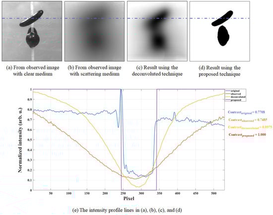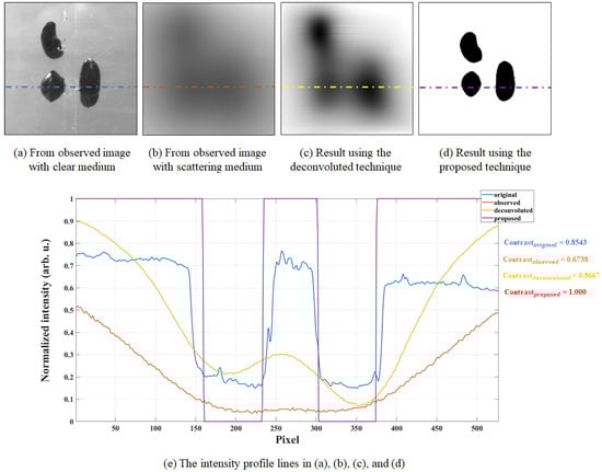 Figure 9b illustrates the observed image of the same structure in a scattering medium, highlighting the scattering effect’s impact on the object’s apparent width and contrast, recorded at