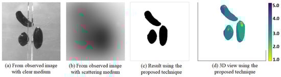 Figure 11b shows the image in a scattering medium, where the scattering effects obscure the object’s dimensions.