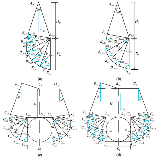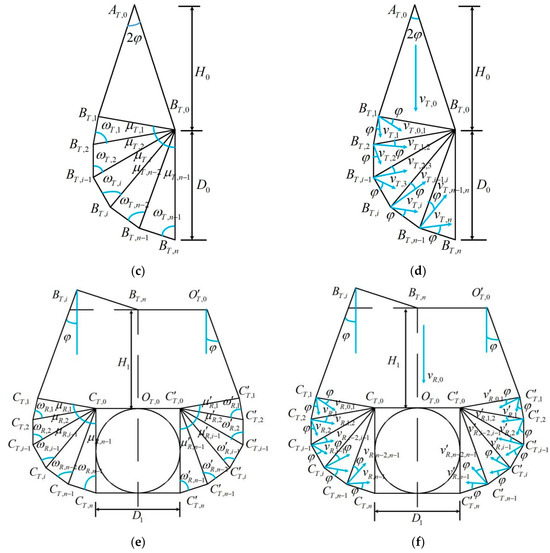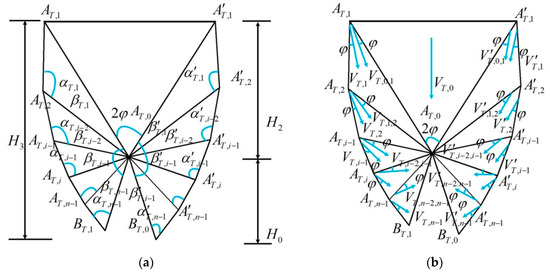 Following the upper bound theorem of limit analysis for geotechnical masses, the discontinuity between the neighbouring blocks is called the velocity discontinuity line [24], and plastic flow occurs only on the velocity discontinuity line. As shown in Figure 2a,b, it is assumed that the velocity of the triangular block is . The velocity expressions for the velocity discontinuity lines and in the M−1 region are given in Equations (1) and (2), respectively.