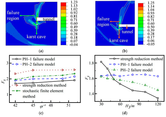 As shown in Figure 4d, when the tunnel depth is 50 m, the safety factor achieved by the finite element strength reduction method is 0.30% larger than that of the PH−2 failure model. The safety factor obtained in the PH−1 failure model is 3.10% greater than that calculated in the PH−2 failure model. At a tunnel depth of 100 m, the safety factor obtained in the PH−1 failure model is 8.38% greater than in the PH−2 failure model. The safety factor obtained in the PH−2 failure mode is 5.84% greater than that calculated by the finite element strength reduction method. This study has revealed that the safety factor obtained by the finite element strength reduction method and the safety factor [27] based on the PH−2 failure model decreases significantly with an increasing tunnel depth. The curve of the safety factor in the PH−1 failure model fluctuates only slightly with an increasing tunnel depth.