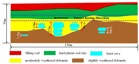 The subway section is the underground engineering of an urban public transport support project in a city, and the engineering geological profile is shown in Figure 5. Karst is more developed in the region, and the diameter of the karst cave is in the range of 1.5 m–17.0 m. The metro tunnel was constructed via the shield-driving method, and the shield tunnel passes through different strata such as hard plastic red clay, moderately weathered dolomite and slightly weathered dolomite. The index table of the physical property parameters of the stratum is shown in Table 2.