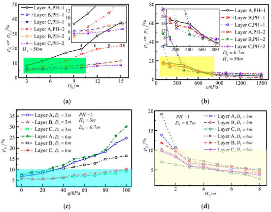 According to Code for risk management of underground works in urban rail transit (GB50652-2011) [28], when the probability value of the risk is greater than 10%, the occurrence probability of the risk is classified as level 1. And when the probability value of the risk is between 1% and 10%, the occurrence probability of the risk is classified as level 2. With a view to analysing the influence of the tunnel diameter on the instability probability of the tunnel’s surrounding rock under the PH−1 failure model and the PH−2 failure model, as shown in Figure 6a, when the tunnel diameter is 3 m and the tunnel is boring in slightly weathered dolomite strata, the instability probability of the M−1 region in the PH−1 failure mode and the instability probability of the P−1 zone and the P−2 zone in the PH−2 failure mode is 5.5% and 2.86%, respectively. And the difference in the instability probability calculated for the two damage modes is 2.6%. When the tunnel diameter is 8 m and the tunnel is boring in moderately weathered dolomite strata, the instability probability of the M−1 region in the PH−1 failure mode and the instability probability of the P−1 zone and the P−2 zone in the PH−2 failure mode is 7.76% and 7.8%, respectively. And the difference in the instability probability calculated for the two damage modes is 0.04%. When the tunnel diameter is 15 m and the tunnel is boring in the hard plastic red clay strata, the instability probability of the M−1 region in the PH−1 failure mode and the instability probability of the P−1 zone and the P−2 zone in the PH−2 failure mode is 37.59% and 21.95%, respectively. And the difference in the instability probability calculated for the two damage modes is 15.64%.
