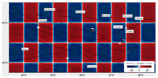 Figure 3 shows the theoretical gravity anomalies at the ground surface associated with a checkerboard model with a resolution of 0.5° × 0.5°, as well as the spatial distribution of the monitoring stations in the study area. The locations of the stations are marked by grey rectangles, and the color of the rectangular patches indicates the measured gravity anomalies at the ground surface. The monitoring stations are unevenly distributed in the study area, and the employed resolution was chosen after considering the source resolution capacity of the stations, the optimal design and layout of the monitoring network, and the uncertainty of the source signals [52]. Then, the theoretical gravity anomalies with a checkerboard pattern were inverted to obtain the crustal apparent density using the equivalent source inversion method. The results are presented in Figure 4, where the grey rectangles mark the locations of the surface monitoring stations. The obtained source parameters can provide a reliable reference for the gravity variations in different regions. The figure shows that the predetermined source parameters cannot be accurately recovered in regions far away from the monitoring stations, and that there are certain areas that are not covered by the monitoring network. At the edges of the covered area, the inverted source body densities therefore show transition features, mainly manifested as the constraints of spatial smoothing regularization. The test shows good resolution in the area covered by the monitoring network, and the results were representative of the surface gravity changes induced by the regional crustal material migration. This indicates that the network’s resolution would not have significant impacts on the subsequent inversion of the actual mobile gravity data.