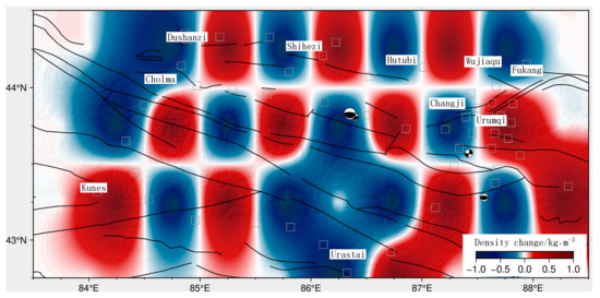 Previous studies have shown that the Junggar block is subducted beneath the Tianshan block under near north–south compressive stress, forming a multi-layered wedge-shaped thrust system in the shallow crust of the Tianshan piedmont in the study area [84]. Although earthquakes in the study area have mainly occurred on shallow blind thrust faults or fault-related folds, moderate to strong earthquakes on deep faults can also trigger ruptures at shallow depths, resulting in even more serious consequences than the mainshock. The deep blind faults and fault-related folds present in the study area should therefore also receive attention. The spatiotemporal variations in the gravity field can reflect the movements of major tectonic faults in the monitored area [2], and deep tectonic activities are also capable of altering the surface gravity field [85]. This enables the extraction and analysis of anomalous gravity field signals to evaluate the seismic risk of a region. Because the inversion of crustal apparent density can reflect deep material migration and medium flow, the comprehensive analysis of the apparent density variation trend and the tectonic activity background can help in the identification of possible anomaly signals before an earthquake, which is essential for seismic risk assessment and early earthquake warnings.