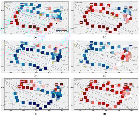 Figure 6a shows the apparent density variation pattern in the study area from August 2016 to August 2017. Apparent density anomalies were generally distributed along the trend of the tectonic structures, with distinct zoning features. The Urumqi piedmont depression was a region with negative changes, while the foothills of the North Tianshan Mountains showed positive variations. These density changes verified our inference based on the gravity changes described above, i.e., that the crustal media were migrating from the north to the south. There was an incongruous negative anomaly at the epicenter location, where the density variation contour bends southward, out of line with the tectonic trends. We believe that this feature was not simply caused by noise but very likely constitutes a manifestation of deep crustal material migration before and after the earthquake. According to the theory of isostasy, the regional uplift of the crust will lead to a decrease in its density, thus achieving a state of mass balance among different regions [56]. Therefore, the anomaly shown in Figure 6a may reflect the influence of post-seismic surface deformation and crustal uplift on subsurface media; that is, the seismic activity led to crustal uplift, which induced a decrease in crustal density. The possible reasons for this anomaly are further discussed and verified in combination with the InSAR data in the next section. Figure 6b shows the apparent density change pattern in the study area from August 2017 to August 2018. The region with positive apparent density variation, which was previously distributed along the trend of tectonic structures, significantly expanded toward the north, and the negative anomalies were only distributed in a small area northeast of Urumqi. This phenomenon suggests that the crustal density deficit at the Urumqi piedmont depression was restored after the earthquake. On 20 January 2018, a magnitude 4.9 earthquake occurred at the junction of positive and negative gravity field changes in the Urumqi area, with an epicenter also located at the junction of positive and negative changes in apparent density. We suggest that the migration of subsurface materials altered the tectonic stress field, thereby triggering the fault activity. Figure 6c shows the apparent density change pattern in the study area from August 2018 to July 2019. The regions with positive and negative apparent density changes in the study area were completely interchanged, with the foothills of the North Tianshan Mountains and the Urumqi piedmont depression showing a decrease in apparent density and the north of Urumqi City and the Hutubi area showing an increase. During the crustal density change, a magnitude 4.9 earthquake occurred again in Hutubi on 18 August 2018. Figure 6d shows the apparent density change pattern in the study area from July 2019 to August 2020. The zoning features in the study area became more prominent, with an enhanced negative apparent density change in the Dushanzi area, and the region with an increase in apparent density shifted to the south, indicating that crustal material migration occurred again from the west to the east in the study area. Figure 6e shows the apparent density change pattern in the study area from August 2020 to July 2021, displaying obvious zoning features. The regions with an increase in apparent density expanded around Dushanzi, Cholma, and Shihezi but shrunk around Urumqi. The degree of apparent density decrease at the foothills of the North Tianshan Mountains was reduced. On 8 August 2020, a magnitude 4.9 earthquake occurred in Toksun County, where the apparent density change was turning from positive to negative, once again corresponding to the crustal material migration feature in this region. Figure 6f shows the apparent density change pattern in the study area from July 2021 to July 2022, displaying a predominantly increasing trend, while an apparent density decrease was only locally distributed in Urumqi. This increase in apparent density in the study area suggests that the tectonic stress had been accumulating and that the energy level in the study area may be increasing.