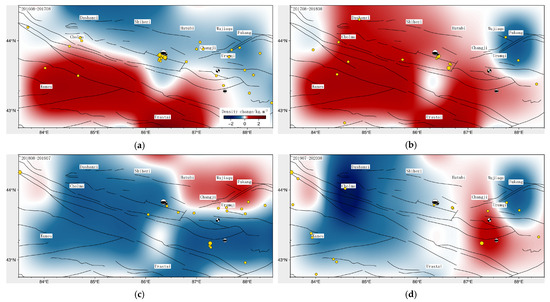 Figure 5a shows the gravity change pattern in the study area from August 2016 to August 2017. The gravity field in the entire region exhibited apparent zoning characteristics. The Urumqi piedmont degression region was dominated by negative gravity variations, and the foothills of the North Tianshan Mountains all showed positive gravity changes. On 8 December 2016, a magnitude 6.2 earthquake occurred in Hutubi. As shown in the figure, this earthquake occurred at the junction of positive and negative gravity changes, confirming the migration of subsurface materials in this region. The foothills of the North Tianshan Mountains are subjected to intense uplift, and the gravity field change should thus be negative. The Urumqi piedmont degression is undergoing mild subsidence, and its gravity field change should be a positive value of relatively small magnitude. However, we found exactly the opposite (Figure 5a), with the strongly uplifting foothills of the North Tianshan Mountains showing dramatic positive variations, indicating that subsurface medium migration did occur in this region. The regional tectonic stress around the epicenter had changed, and the subsurface media were migrating from the north to the south, eventually triggering the Hutubi earthquake. We believe that these factors probably constituted the main causes of the Hutubi earthquake. Figure 5b shows the gravity change pattern in the study area from August 2017 to August 2018. Compared with the pattern from August 2016 to August 2017 (Figure 5a), the regions with positive gravity changes increased throughout the study area, and the gravity field variation around the epicenter turned from negative to positive. Negative gravity anomalies appeared in the eastern part of the Horgos–Manas–Turpan fault, north of Urumqi City, and in other local areas, suggesting that the tectonic stress field and subsurface medium distribution in the Urumqi piedmont depression region had recovered after the earthquake. On 20 January 2018, a magnitude 4.9 earthquake occurred at the junction of positive and negative gravity changes in the Urumqi area, presenting apparent correlations with the positive gravity variation anomalies at the foothills of the North Tianshan Mountains. Figure 5c shows the gravity change pattern in the study area from August 2018 to July 2019, which presents as completely changed, with the foothills of the North Tianshan Mountains and the Urumqi piedmont depression region showing negative gravity variations and the southern Junggar Basin turning into a positive gravity change zone. On 18 August 2018, another magnitude 4.9 earthquake occurred in Hutubi; at this time the gravity field anomaly was changing from positive to negative, which further indicates that subsurface medium migration or exchange might occur in the study area. It has been frequently reported that moderate to strong earthquakes tend to occur in the four quadrants of gravity changes, anomalous regions showing alternating positive and negative gravity changes, or areas with a strong gravity gradient [1,53,54].