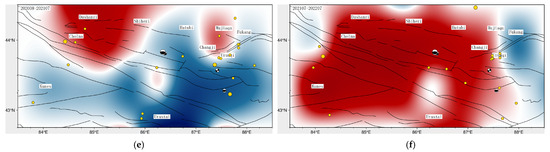 Figure 5d demonstrates the gravity change pattern in the study area from July 2019 to August 2020. Compared with Figure 5c, most of the study area was dominated by negative gravity changes, and the region with positive change was migrating southward in the horizontal direction. The degree of negative gravity variation increased in the western part of the study area, including the Cholma region, indicating that migration of subsurface materials from the west to the east was again occurring in the study area. There was an isolated point of positive gravity change in the Shihezi area, suggesting that tectonic stress might be accumulating in this region. Figure 5e shows the gravity change pattern in the study area from August 2020 to July 2021. Regions with positive gravity changes were distributed in Dushanzi, Shihezi, and Cholma and extended along the Horgos–Manas–Turpan fault to the north of Urumqi. The foothills of the North Tianshan Mountains still showed negative gravity changes. On 8 August 2020, a magnitude 4.9 earthquake occurred in Toksun County, a transition zone between positive and negative gravity anomalies. This seismic signal was once again correlated with the gravity field anomaly. Figure 5f shows the gravity change pattern in the study area from July 2021 to July 2022. The gravity field in the study was dominated by positive changes, with negative gravity variations only locally distributed in Urumqi. The enhanced degree of gravity field changes in the study area indicates that the energy level in this region increased and that tectonic stress was accumulating.