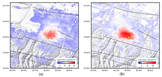 Coseismic deformation fields of the 2016 Hutubi earthquake from the ascending and descending tracks—(a) Deformation field from the ascending tracks; (b) deformation field from the descending tracks. The yellow star indicates the epicenter of the earthquake. The solid black lines represent faults.