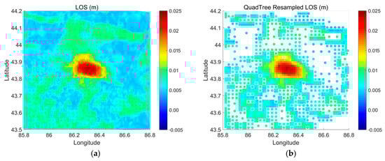 Results of quadtree downsampling of the 2016 Hutubi earthquake data. (a) Before downsampling; (b) after downsampling.