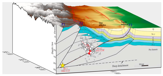 Geological profile of the study area interpreted based on seismic reflection data, modified from Lu et al. (2018) [41]. Solid lines indicate interpreted faults and dashed lines represent axial planes. White circles are the aftershocks of the 2016 Hutubi earthquakes, solid red lines are the surface fault ruptures, and the yellow star marks the epicenter of the 1906 Manas earthquake.