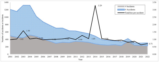 Figure 1 presents the RSIS dataset, offering a comparative analysis of “Incidents” and “Accidents” during the years 2001 and 2022. Herein, “Fatality” encompasses the total number of deaths and/or injuries resulting from any railway accident. In 2001, the dataset records 498 “Incidents”, a number that exhibited a noteworthy reduction to 227 in 2022. This reduction in “Incidents” is reflected in an annual growth rate (AGR) of −3.7%. Similarly, the data indicates a decline in “Accidents” from 710 instances in 2001 to a mere 80 occurrences in 2022. This remarkable decrease in “Accidents” corresponds to an AGR of approximately −9.9%. The negative AGR values underscore a substantial decline in both “Incidents” and “Accidents”, with “Accidents” displaying a more pronounced reduction over the specified period. It is worth noting that, aside from an anomaly in the year 2014, where a train collision resulted in 477 injuries (based on the statement of accident overview in the data field of RSIS dataset, following a rear-end collision of a departing train from Sangwangsimni station with an incoming train on 2 May 2014), the number of fatalities per accident has remained relatively stable. The rationale for this development lies in the widespread adoption of state-of-the-art technological innovations, including advanced safety systems such as automatic train control, train radio communications, various grade level crossing solutions, and passenger safety doors. Notably, this period has witnessed the extensive implementation of these technologies by numerous railroad operators, coupled with the strategic repositioning of level-crossings to subterranean or elevated positions [