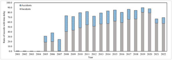 Figure 2 represents the ratio of the number of accidents and incidents with time delay records. A total of 14,771 accidents and incidents occurred, and only 38.3% of them had a time delay record of 22 years on average. In detail, the proportion was only a small portion of 0.9% in 2001 and 2007, but increased noticeably to an average of 78.8% in the remaining years. In general, reporting of train accidents and incidents follows the guidelines on railway accident and investigation reporting. This guideline was established under the Railway Safety Act in November 2007, and serves to define the specific procedures and methods for reporting railway accidents. It aims to ensure the timely and accurate reporting of such incidents. Therefore, this study used the data for the analysis starting from 2008. This is because it was recorded in accordance with appropriate methods and procedures of subsequent guidelines.