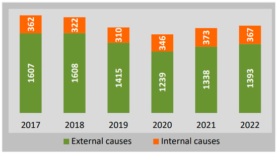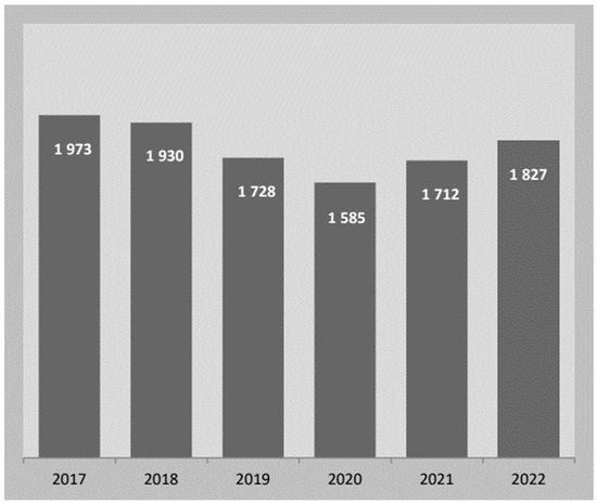 40]). According to the UIC report, the annual count of significant accidents decreased by approximately 25% in 2014 compared to 2006. The period of 2017–2020 sees a slow decrease in significant accidents, with its lowest level in 2020. 2020 was an exceptional year due to COVID-19 restrictions, and significant accidents slowly increased in 2021 with 1712 records, which is comparable to the pre-COVID-19 year 2019 (−1%). An increase in significant accidents for the established members in 2022 can be explained by a significant rise in traffic (see