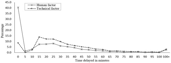 The percentage of accident delays recorded as zeros was 41.4% for human factors and 9.1% for technical factors, showing a very large difference. This is the reason why the average delay time due to human factors is lower than that due to technical factors, as shown in